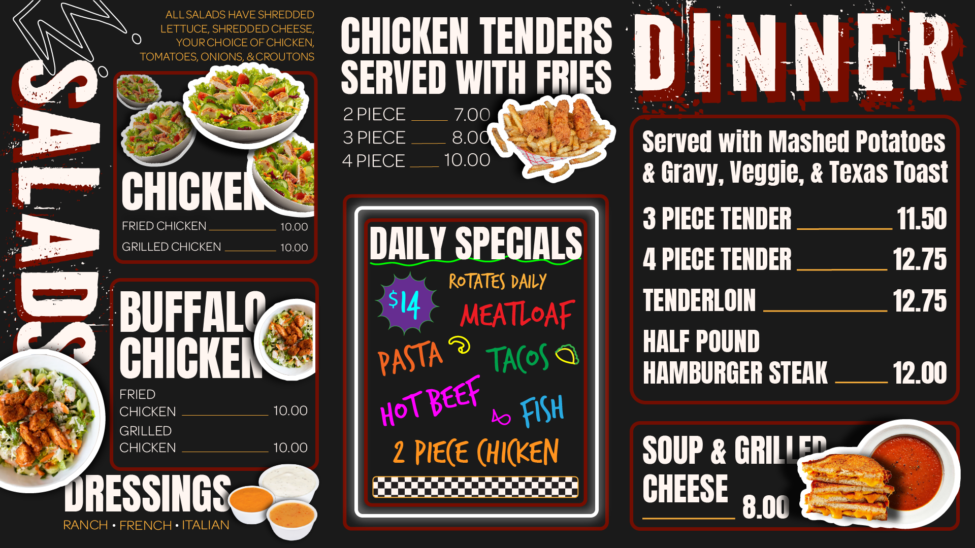 This project was for a quick style restaurant. Serving breakfast, smashburgers, and homestyle meals & more there is something for everyone to enjoy. Being attached to a gas station I incorporated the tagline “Eating Made Easy”. Great food at a great price while you’re on the go!